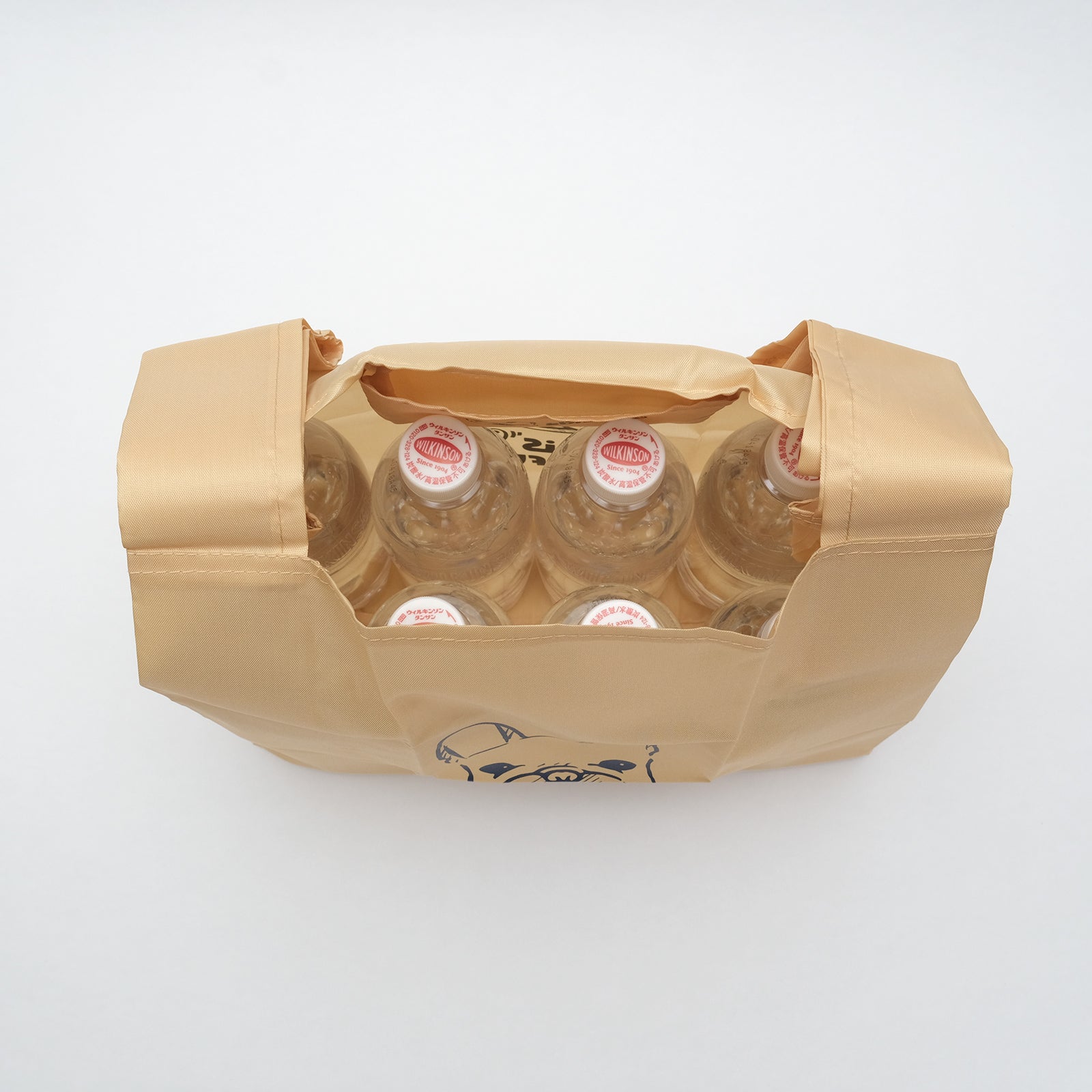 500mlのペットボトルが8本入り、幅広の持ち手で重たいものも安心です。バッグの内ポケットに小さく畳んで収納できてコンパクトになるので携帯にも便利です。