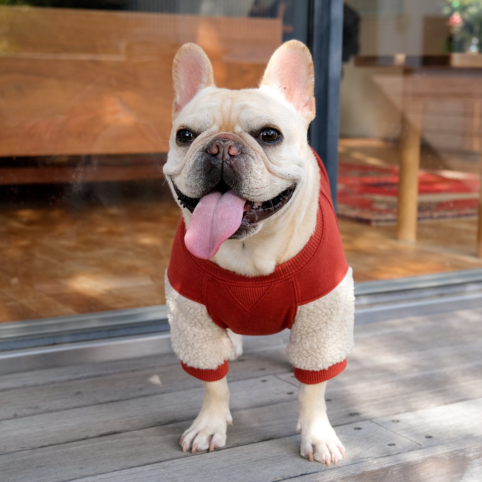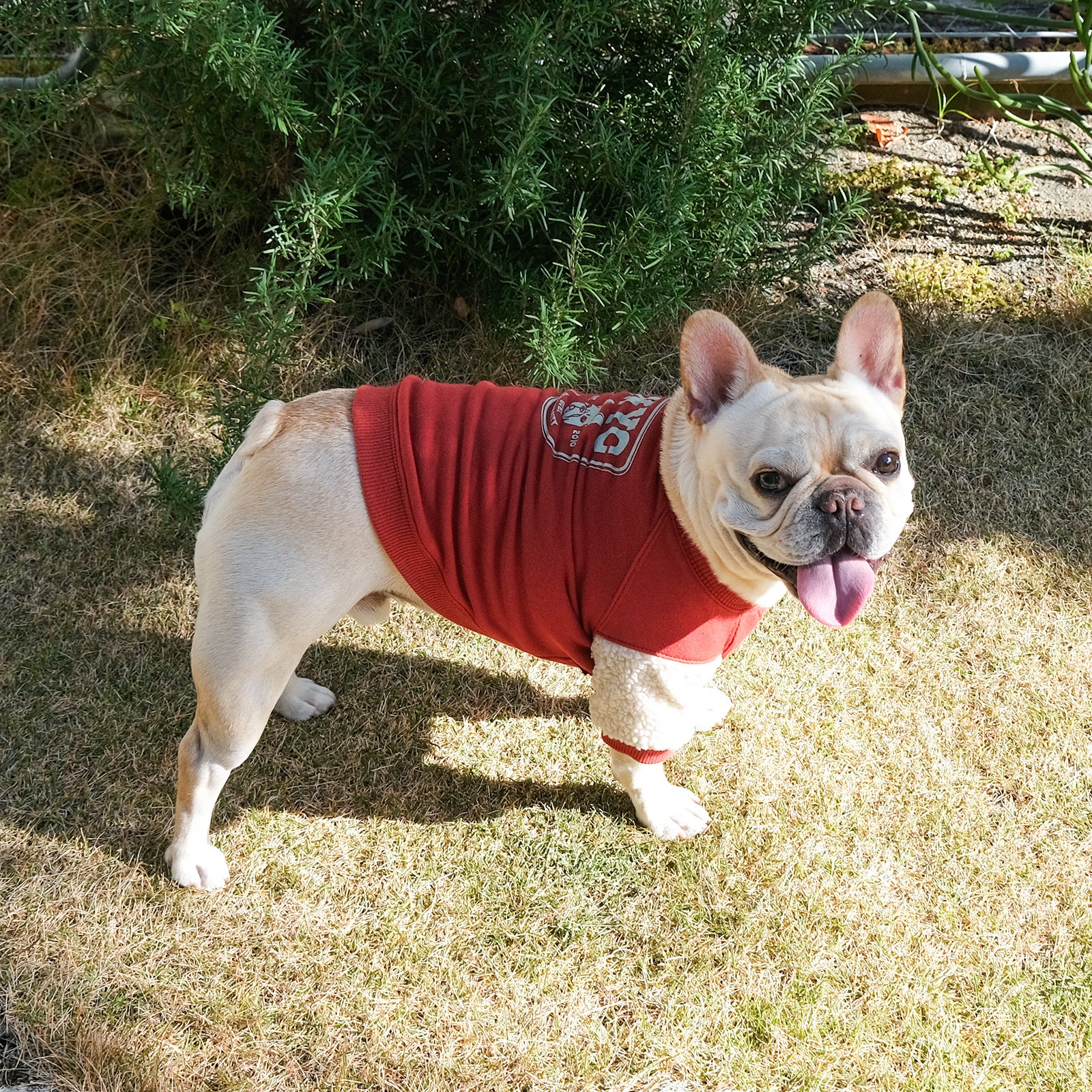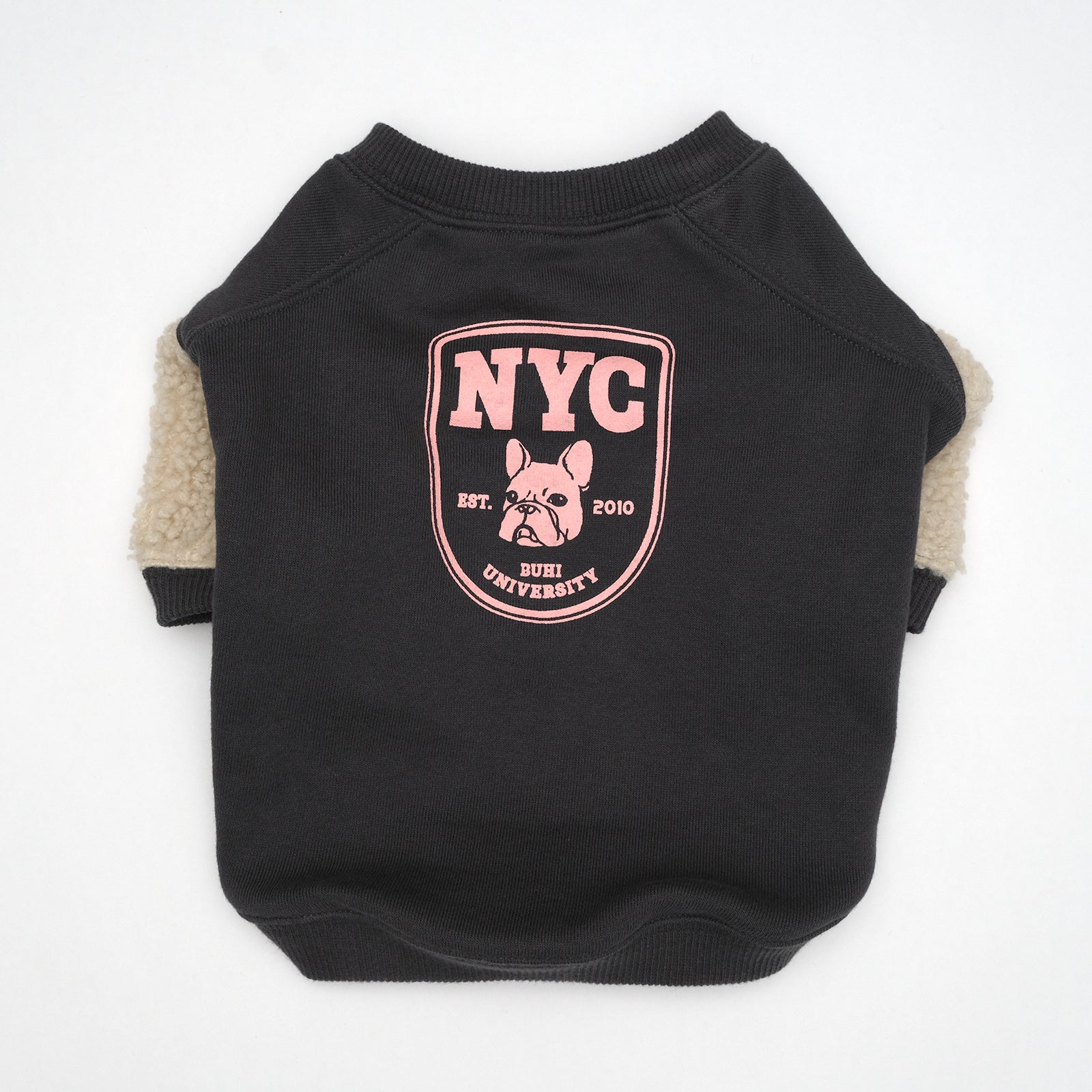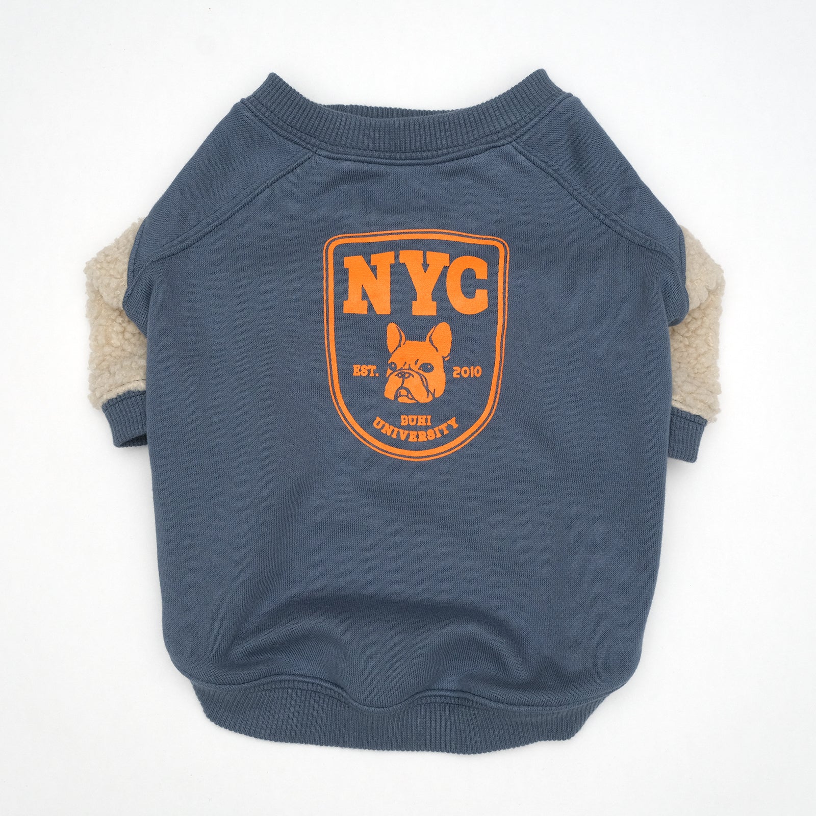 希少性の高い「アズマ」の編み機を使用した裏毛です。ゆっくり編み上げることでふっくら柔らかな風合いで、裏のループが綺麗なのが特長です。バックにブヒNYC大学のロゴをプリントしました。フロントにVガゼット、袖をふっくらと柔らかくもこもこなプードルパイルで切替えました。どこから見ても可愛い仕上がりになっています。同じデザインのオーナー用スウェット/フーディ/ブヒ用フーディも用意しました。お揃いコーデもおすすめです。 素材ボディ:コットン100%/パイル:ポリエステル100%モデルサイズ クリーム:首周り 42cm / 胴周り 57cm / 体重 11.5kg / FB-Lサイズ着用フォーン:首周り 43cm / 胴周り 57cm / 体重 10.7kg / FB-Lサイズ着用