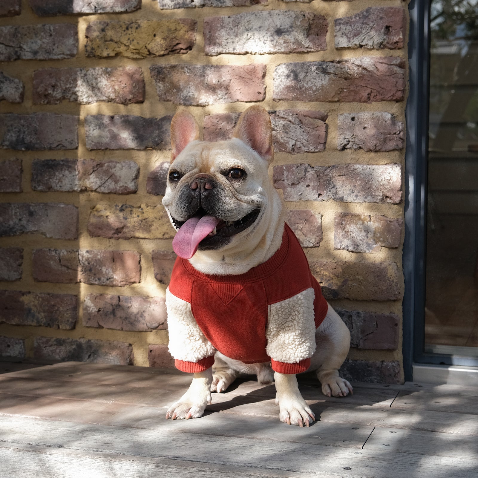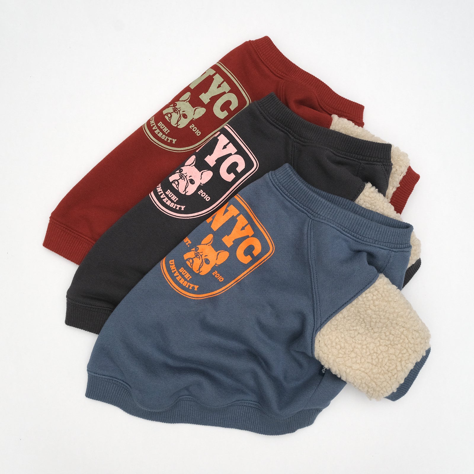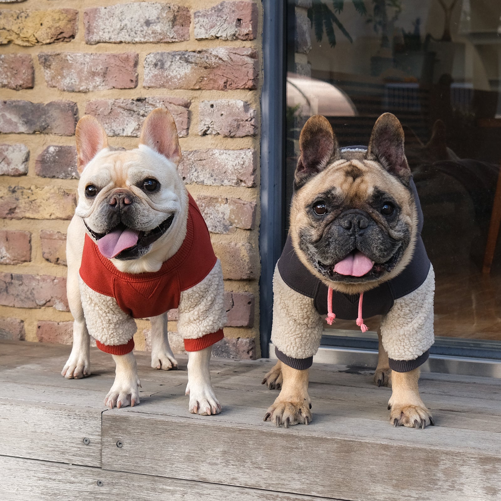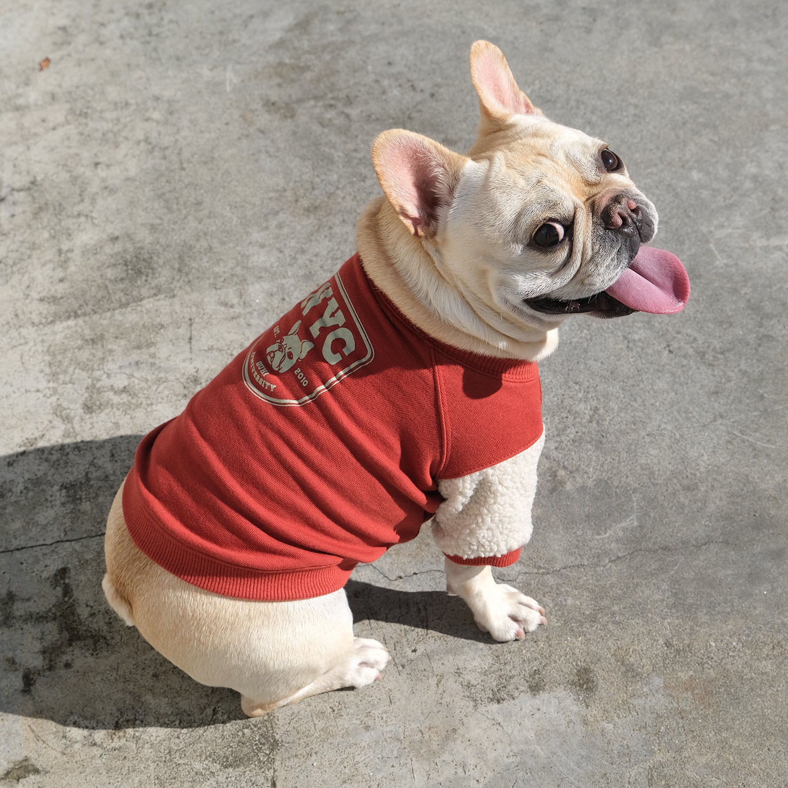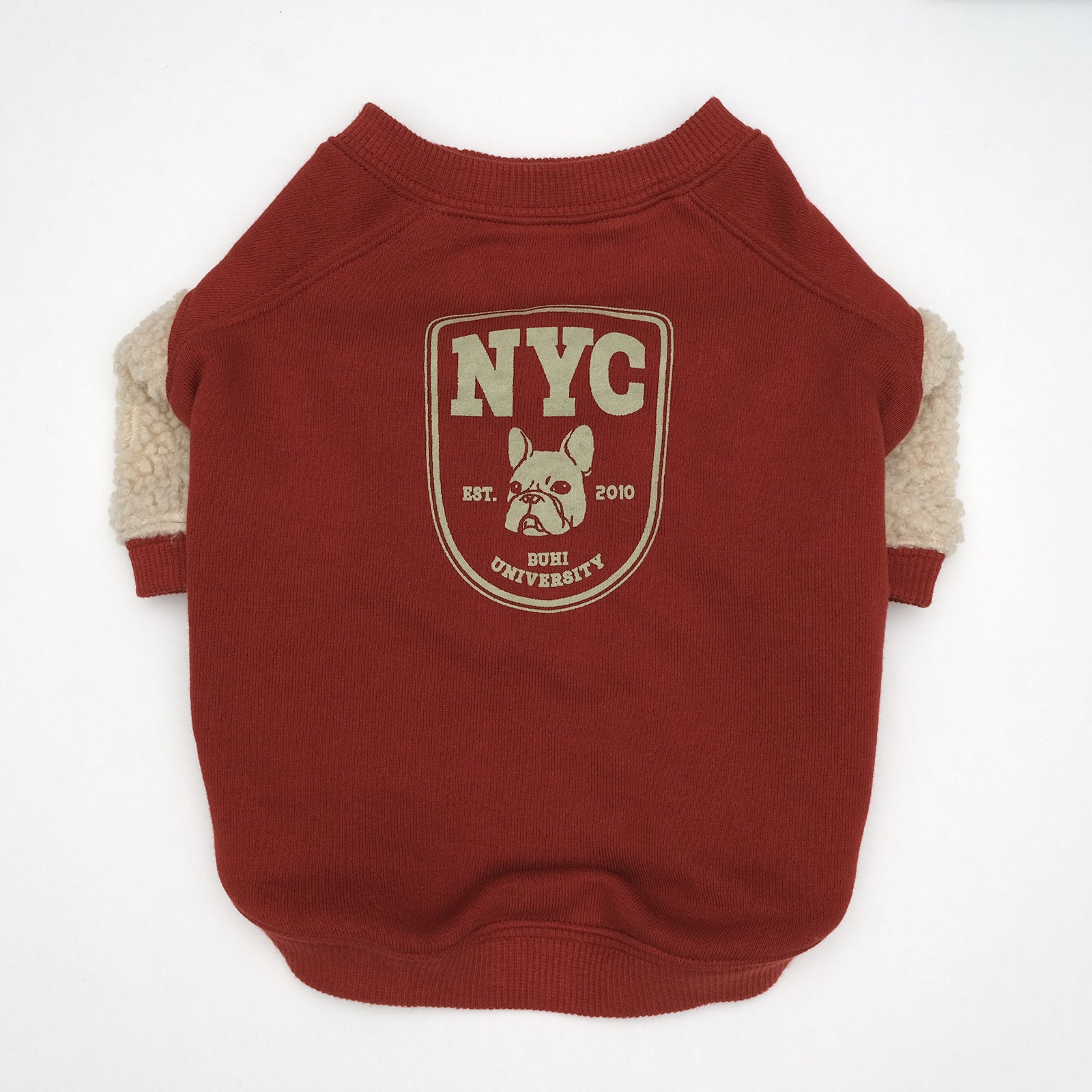 希少性の高い「アズマ」の編み機を使用した裏毛です。ゆっくり編み上げることでふっくら柔らかな風合いで、裏のループが綺麗なのが特長です。バックにブヒNYC大学のロゴをプリントしました。フロントにVガゼット、袖をふっくらと柔らかくもこもこなプードルパイルで切替えました。どこから見ても可愛い仕上がりになっています。同じデザインのオーナー用スウェット/フーディ/ブヒ用フーディも用意しました。お揃いコーデもおすすめです。 素材ボディ:コットン100%/パイル:ポリエステル100%モデルサイズ クリーム:首周り 42cm / 胴周り 57cm / 体重 11.5kg / FB-Lサイズ着用フォーン:首周り 43cm / 胴周り 57cm / 体重 10.7kg / FB-Lサイズ着用