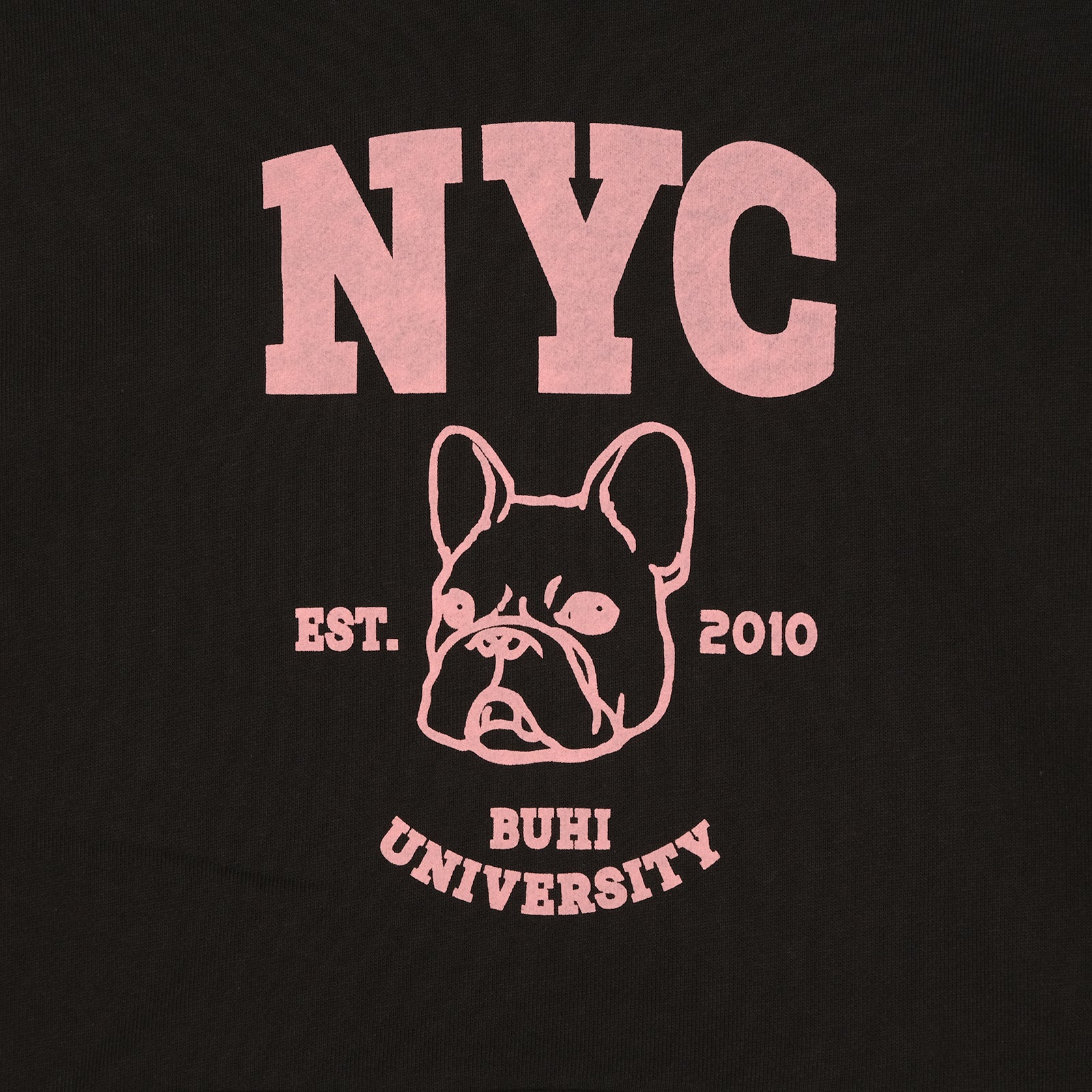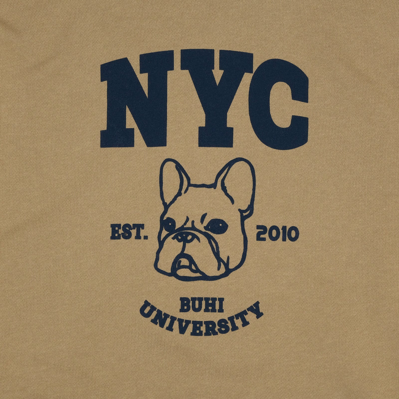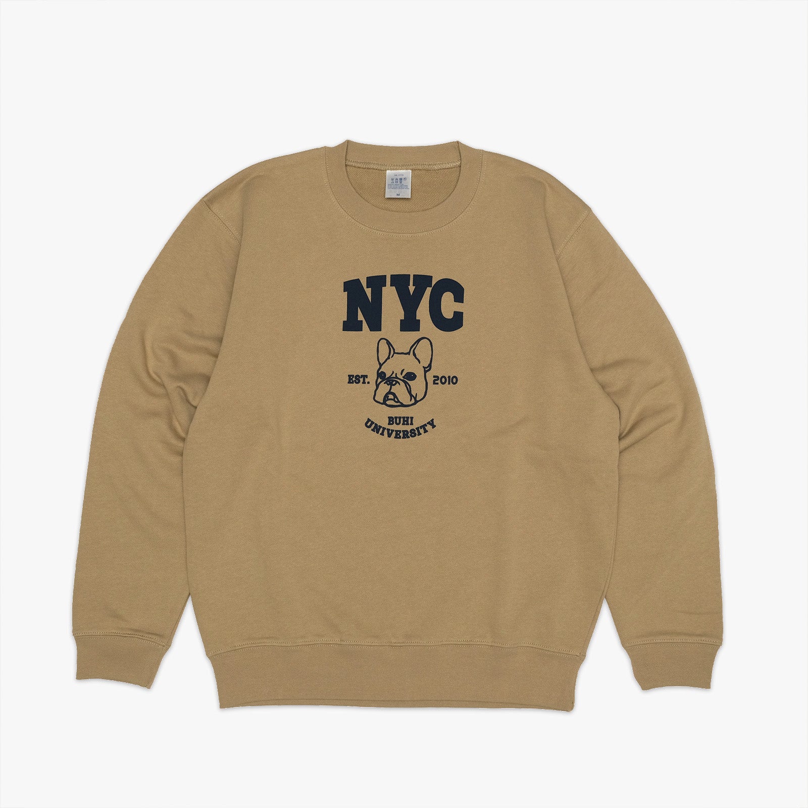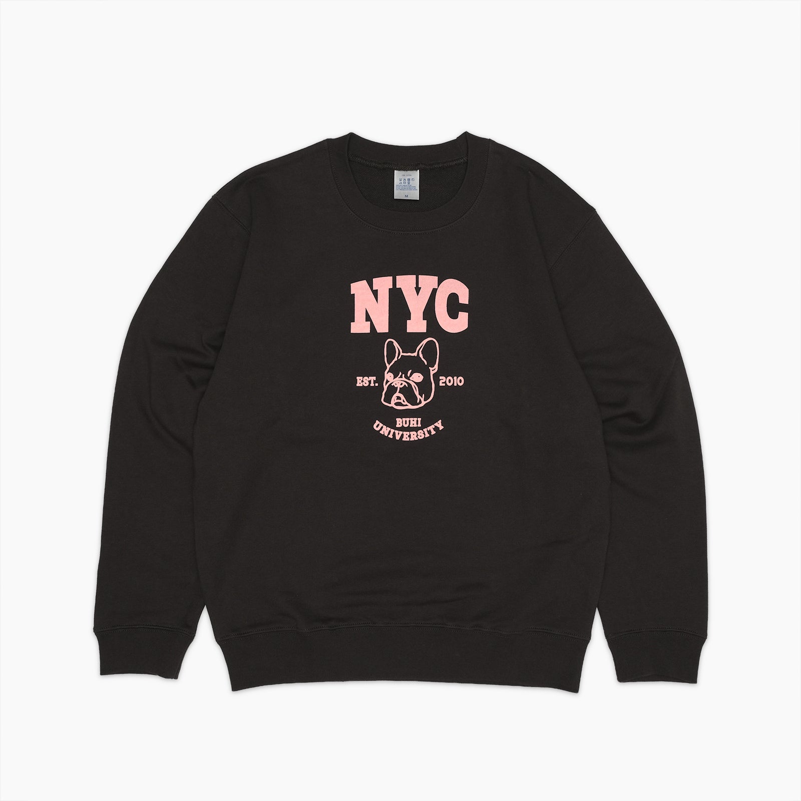 シンプル・スタンダードスタイルで吸水性・伸縮性の優れた裏パイル地に、襟リブ・袖口・裾口にダブルステッチを施した丈夫さとリラックス感を兼ね備えたスウェットです。ブヒNYC大学のカレッジプリントをフロントに。同じデザインのブヒ用スウェット/フーディ/オーナー用フーディも用意しています。お揃いコーデもおすすめです。